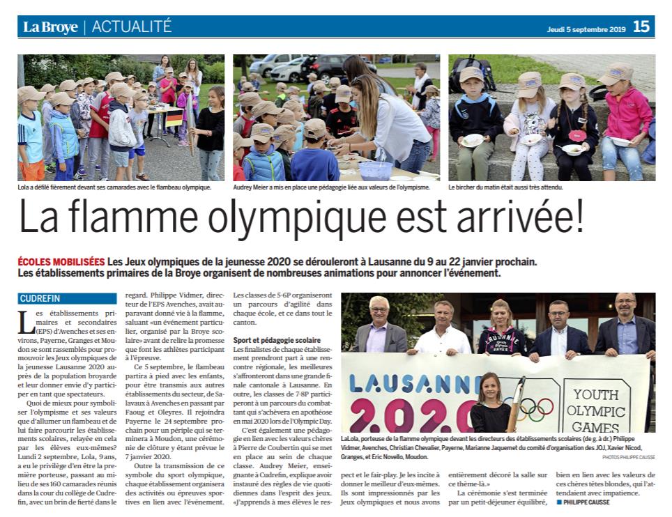 Article de journal paru dans la Broye le 5 septembre. Il relate l'allumage de la flamme à Cudrefin.