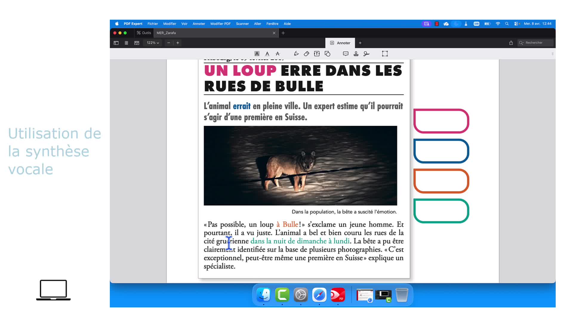- Lire un texte sur un document PDF, mais aussi un texte sur une page internet ou un document Word ou Pages.